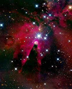 Dieses HaRGB – Bild zeigt den berühmten Konusnebel im Sternbild Einhorn. Er gehört zu NGC 2264, einem Sternhaufen mit zugehörigen Nebeln. An der Spitze des Konusnebels ist die Materie am dichtesten. Es haben sich hier vor einigen zehntausend Jahren neue Sterne gebildet und es entstehen noch weitere, was durch Infrarotaufnahmen nachgewiesen wurde. Der kegelartige Nebel entsteht durch einen dunklen Absorptionsnebel aus kaltem molekularem Wasserstoff und Staub, vor einem schwachen Emissionsnebel. Dieser wird von S Monocerotis, dem hellsten Stern von NGC 2264, ionisiert. Der Konusnebel erstreckt sich über etwa sieben Lichtjahre im südlichen Teil von NGC 2264.